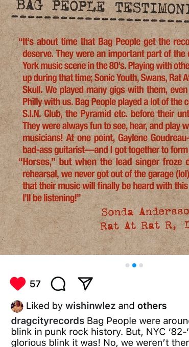 Diane and Carolyn first met in 1977, high school classmates in the western suburbs of Chicago. Sharing an interest in English rock (and drugs!), they put out an ad for a guitarist and met Gaylene Goudreau — then they spent a year or so trying to make it in LA as a Runaways-like girl group called Lois Lain before returning to Chicago, disillusioned. Back home, Gaylene joined DA! and, after a life-changing show opening for DNA, saw the noise-powered path forward for her old band. The three regrouped as Bag People in 1981 and soon enlisted Algis and Pete, performing in Chicago with bands like The Cadavers and The Functionally Illiterate before decamping to Brooklyn's Bed-Stuy neighborhood in late 1982. Later relocating to Manhattan, sharing time at Swans’ practice space, they evolved a set of songs that stood up well with the varied brutalities of all their neighbors — Sonic Youth, Rat at Rat R, Live Skull, False Prophets — playing around New York at CBGB’s, A7, SIN Club, the Peppermint Lounge, and traveling to Philly, DC, Pittsburgh, St. Louis, and Chicago too.